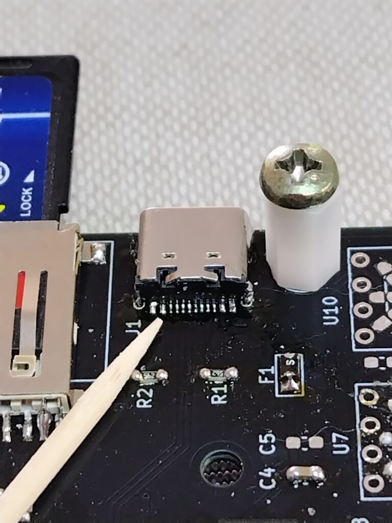 下の写真は基板の上にはんだ付け実装したUSBコネクタです。中心の細いピンの太さは、0.3mm、ピンの間隔は0.5mmです。楊枝を一緒に写真を撮ったのでその細かさが良く分かると思います。当然、ピン一本ずつ半田付けすることはできません。半田ごては先の太さが細い所でも5mm以上あるからです。