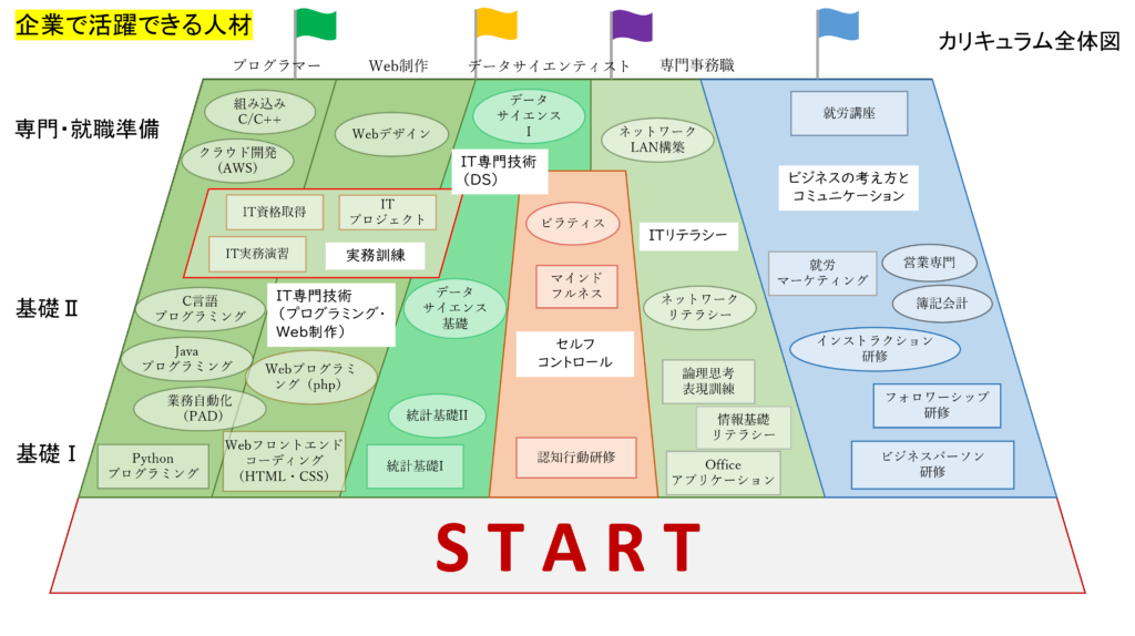 カリキュラムには、リテラシー教育、officeアプリケーション、専門としてプログラミング言語、Webデザイン、データサイエンスがあり、初歩的なものから難度の高いものまで取り揃えています。